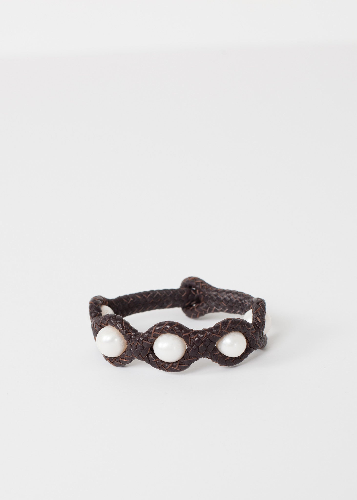 Kalosoma Jewelry demonstrates the rigorous beauty in the handmade. Five freshwater pearls nested delectable braided band. Scarab detail. Knotted closure. Color Brown. 100% Leather. Made in Mexico. Length 7 1/2 inches.