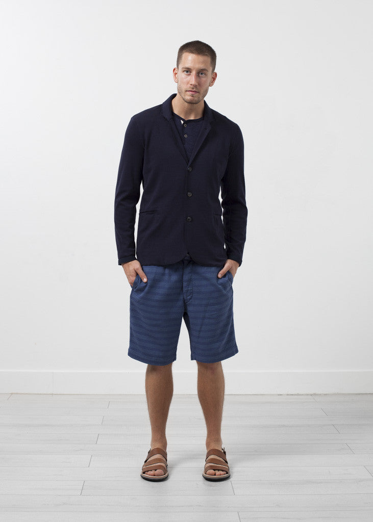 Amiable texture for the pleasure seeking. Plenty of stretch with the coolness of summer. Four button closure at front. Two exterior pockets, one interior. Homecore. Color Navy. 90% Cotton, 10% Elastane. Made in Portugal. Matt is wearing a Large. Matt is 6’2”, Chest 38”, Waist 31”, Inseam 34.5”.