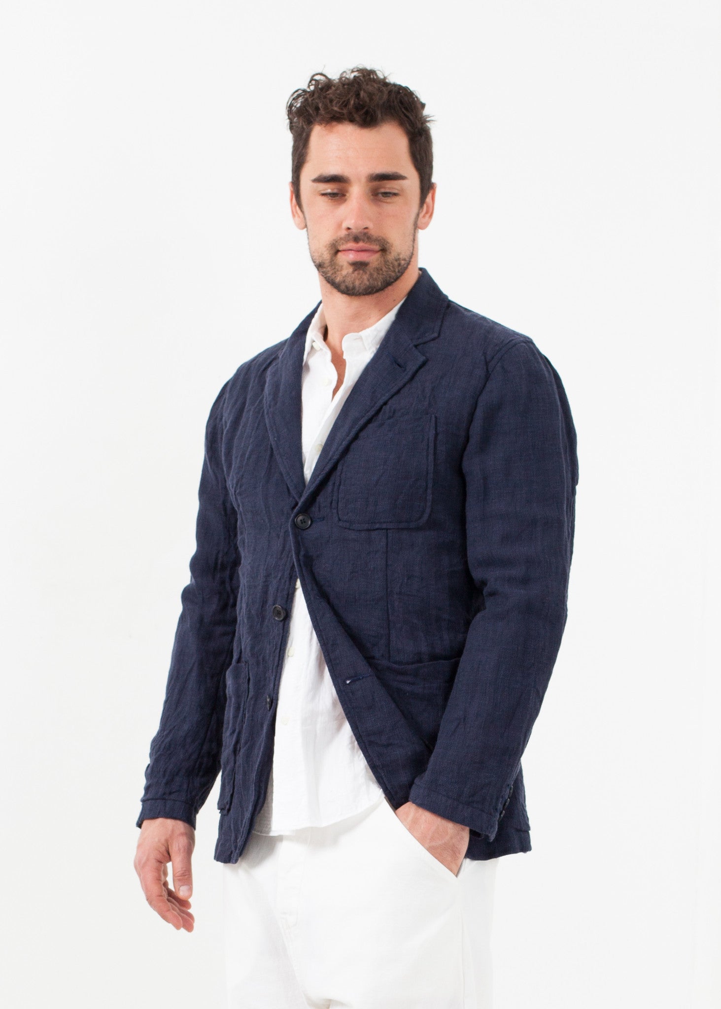 The Floral Lined is ideally versatile with its Hawaiian interior and linen body. Three button closure at front. Three exterior pockets. Fully lined. Sage de Cret. Color Indigo. 56% Linen, 44% Rayon, Lining 100% Cotton. Made in Japan. Jacob is wearing a Medium.