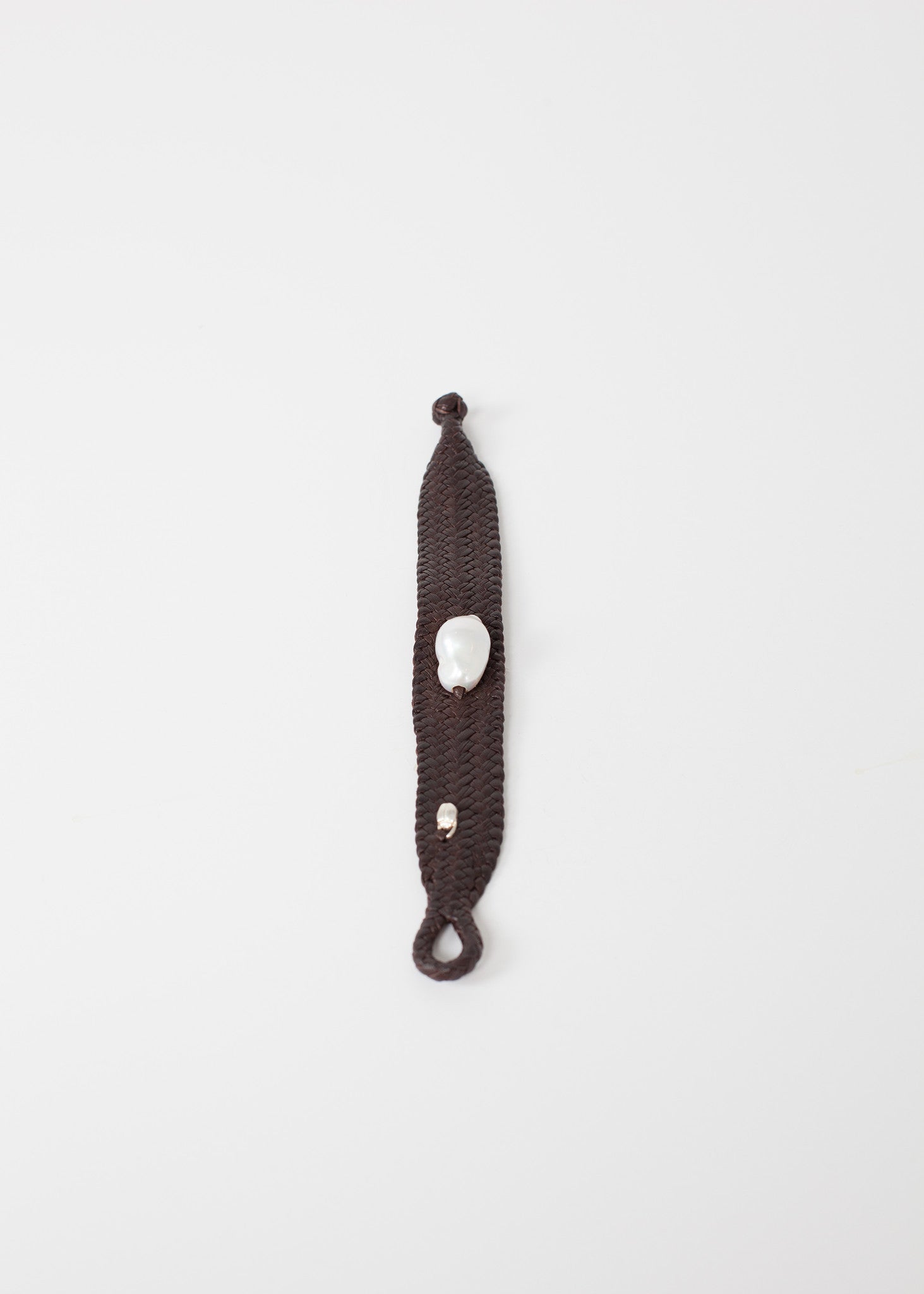 Kalosoma Jewelry demonstrates the rigorous beauty in the handmade. Braided leather acts as the canvas for an asymmetrical pearl. Scarab detail. Knotted closure. Color Brown. 100% Leather. Made in Mexico. Length 7 1/2 inches.