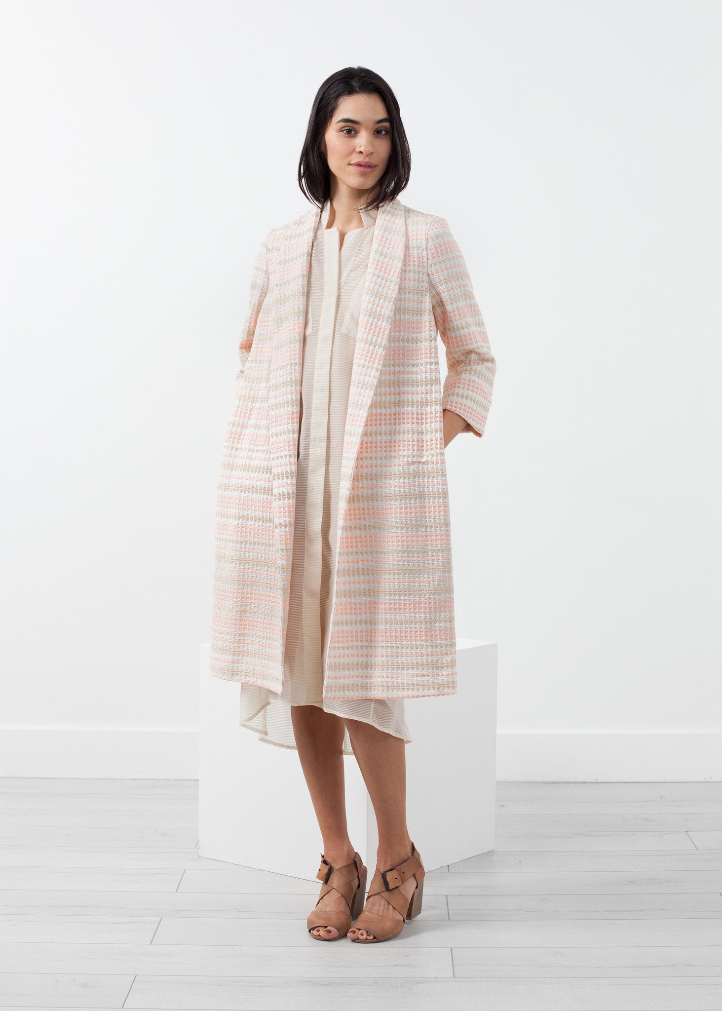 Pretty in peach, the Roulette Jacket is texturally pleasing with subtle sweetness. Side angled pockets at front. Lilith. Color Peach. 81% Cotton, 19% Acrylic Made in Tunisia. Ashley is wearing an X Small.